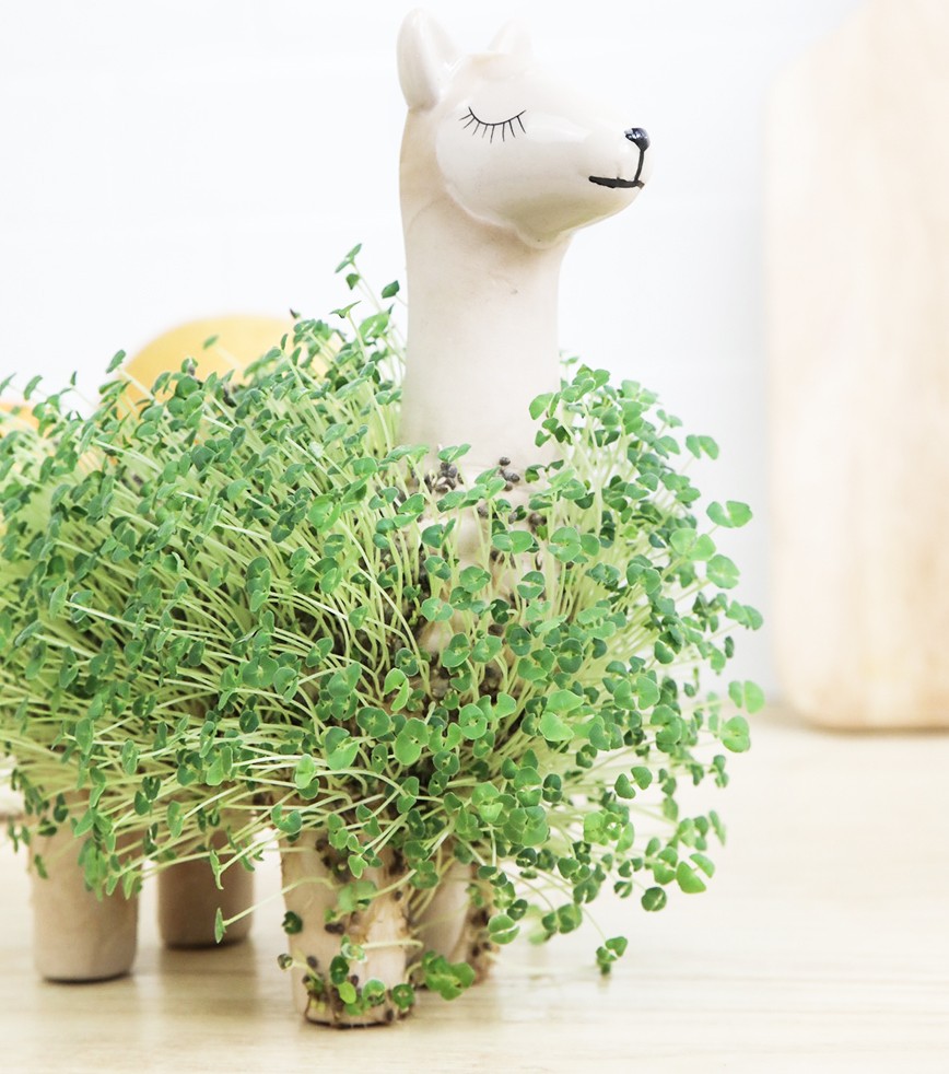 Faites pousser une belle touffe de poils à ce lama ! Ce lama à faire pousser attend votre aide pour que vous cultiviez des graines de chia sur son dos, pour constituer un sublime pelage de verdure !