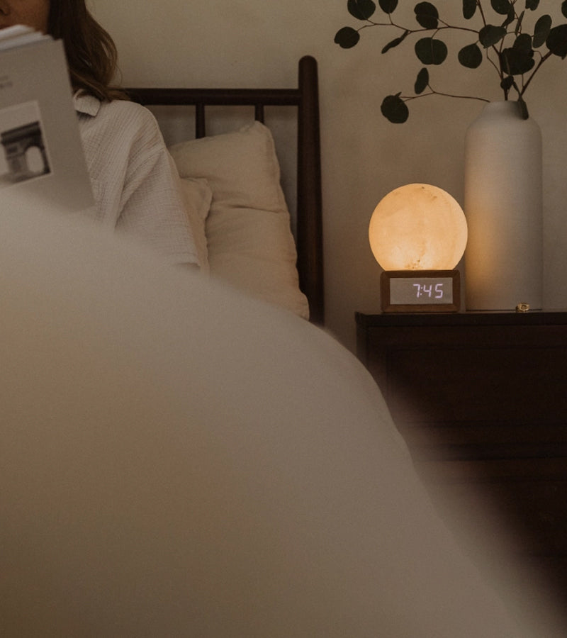 Le réveil sert aussi de lampe de lecture ou de veilleuse, avec une lumière douce et chaleureuse pour favoriser l'endormissement.