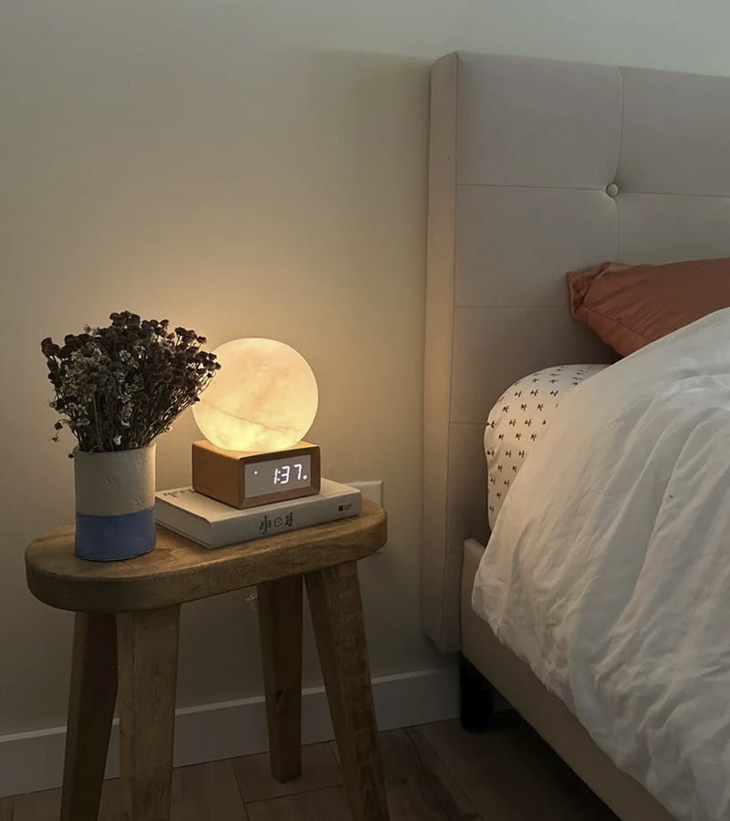 Son design minimaliste s'intègre parfaitement dans n'importe quelle pièce. Plus qu'un réveil, il devient un élément décoratif, ajoutant chaleur et sérénité à votre intérieur. Interface tactile intuitive et luminosité ajustable pour une utilisation facile et personnalisée.