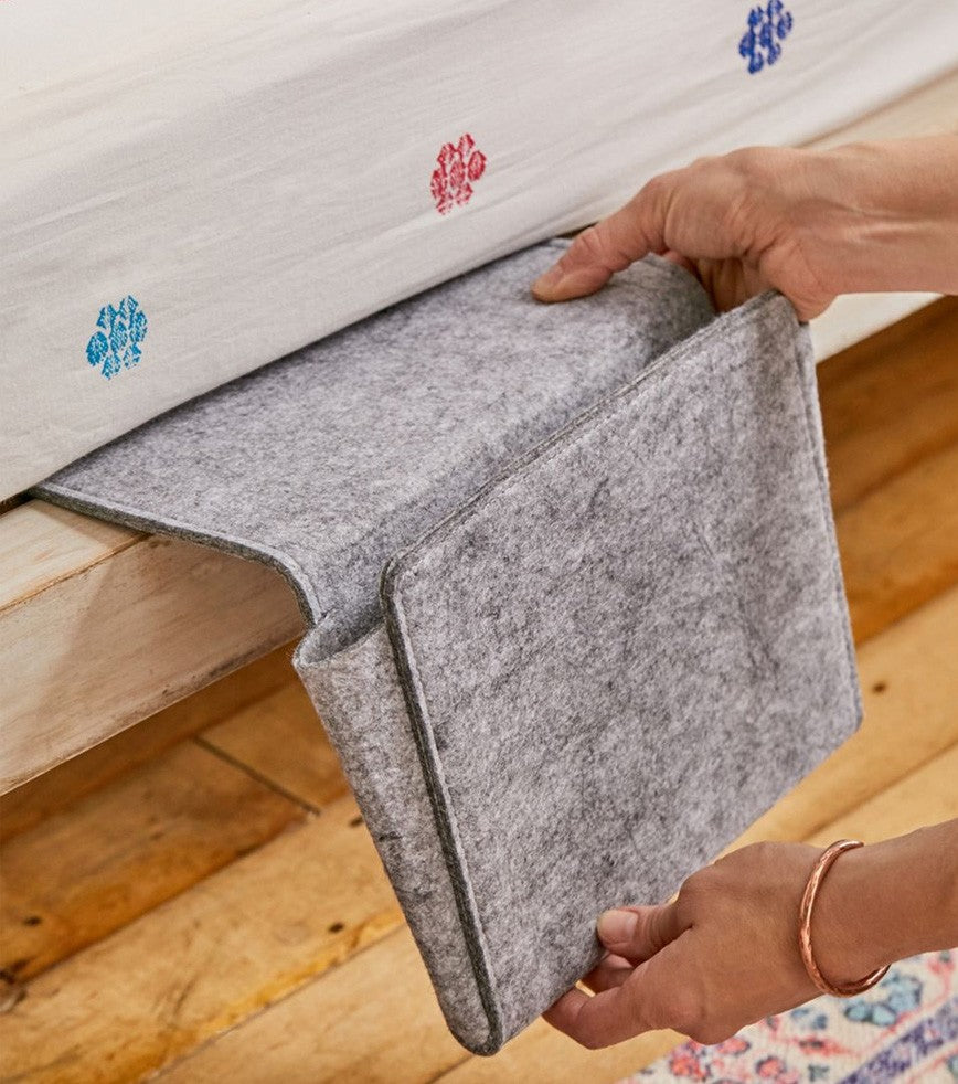 Vous n'avez pas de place pour une table de chevet, ou vous essayez de faire un gain de place dans votre chambre ? Adoptez donc la pochette de chevet, ultra pratique elle se fixe dans le cadre de votre lit et vous pourrez y glisser magazines, tablette, lunettes et plein d'autres petites choses.