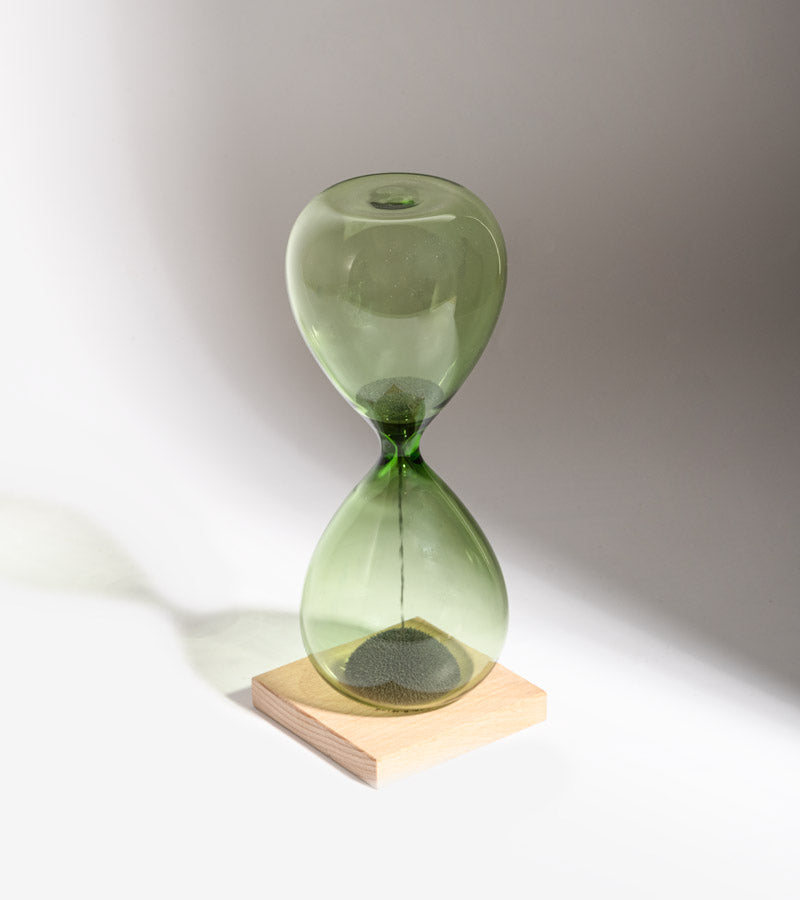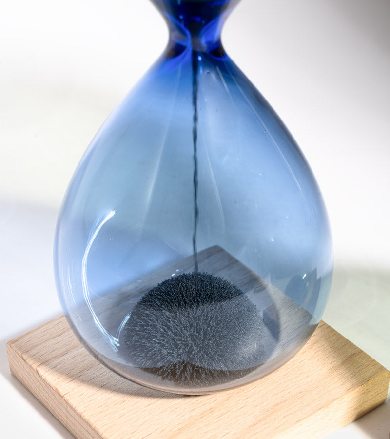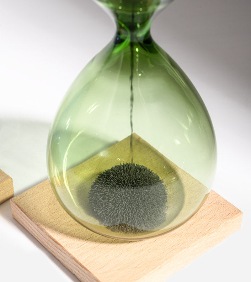 - Matière : socle en bois, sable magnétique, verre soufflé